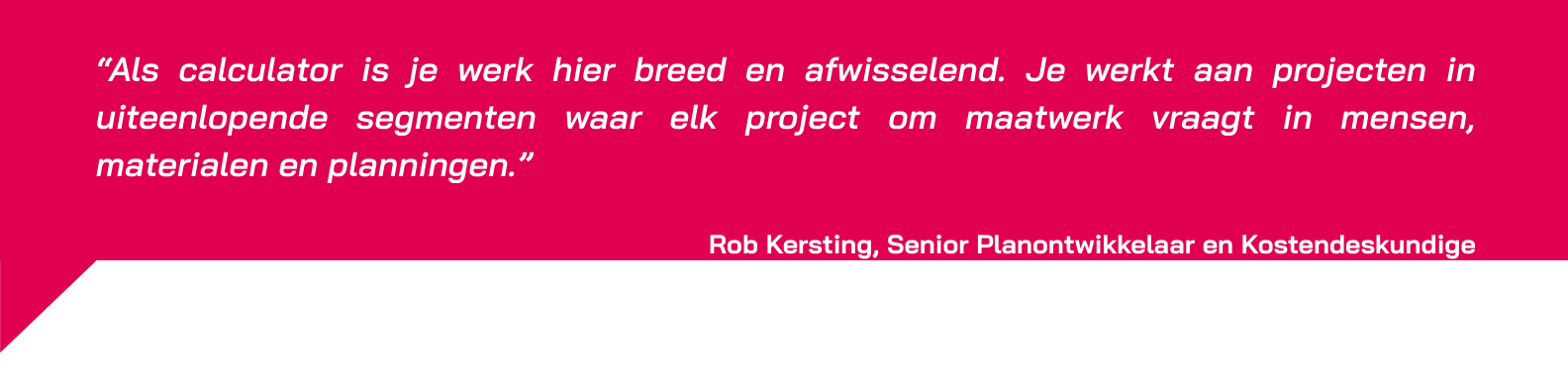 Jij zorgt dat onze projecten financieel kloppen vóórdat we beginnen. Zonder jouw marktkennis en calculaties kunnen we geen goede keuzes maken over ontwerp, planning en uitvoering. Dankzij jouw werk weet de klant waar hij aan toe is en kunnen we verantwoord bouwen, met oog voor mens en gebouw.